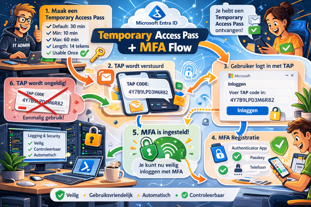 Met een TAP kan een gebruiker tijdelijk inloggen en bijvoorbeeld MFA opnieuw instellen. Maar als beheerder wil je dit natuurlijk consistent, veilig en geautomatiseerd configureren.