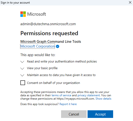Door op Accept te klikken krijgt de Microsoft Graph module toegang.