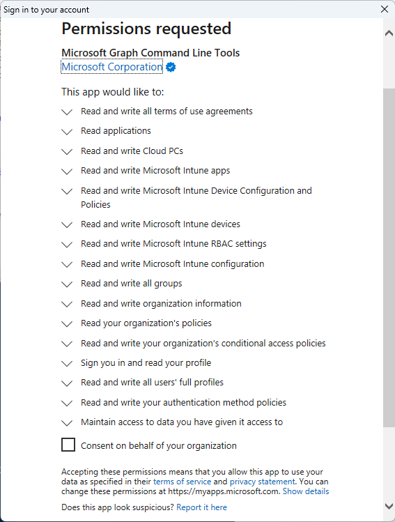 Dit lijkt een lange lijst, maar deze rechten horen bij de Microsoft Graph Command Line Tools.